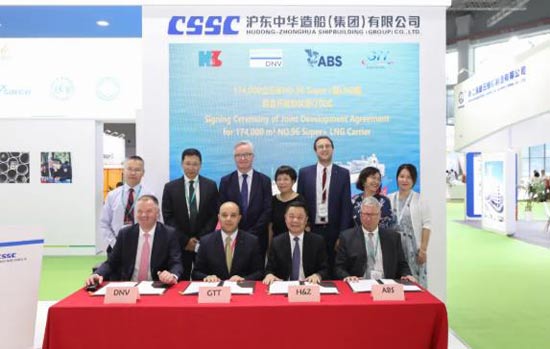 期間,滬東中華造船總經理陳軍、ABS美國船級社東半球總裁Eric Kleess、DNV船級社大中國區總經理Norbert Kray和GTT中國區總經理Adnan Ezzarhouni共同簽署17.4萬方NO.96 Super+型LNG船聯合開發協議。