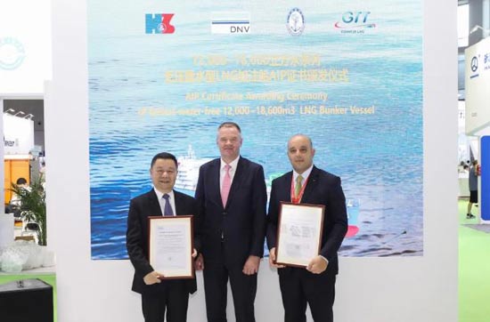 期間,DNV船級社大中國區總經理Norbert Kray、CCS船級社副總裁孫峰分別向滬東中華造船頒發12000立方米~18600立方米系列無壓載水型LNG加注船AIP證書。