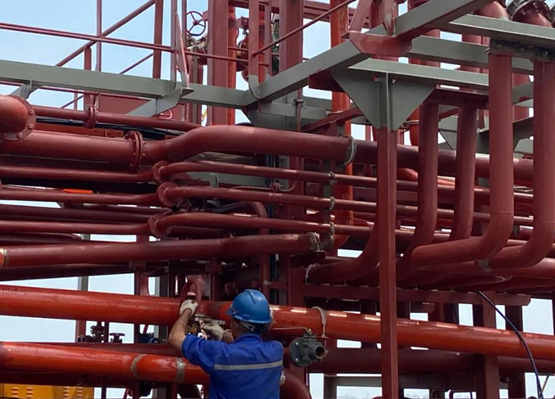 攻關小組首先采取Framo液壓管單元安裝形式,將12路管支架在內場拼裝為組合支架,并同時制作多個單元,再上船安裝,既減少了現場施工的工作量,又大大提高了工作效率。在提升工作效率的同時,攻關小組嚴把產品質量關,嚴格按照工藝要求進行施工,先用臨時支撐固定管件,保證整個管路管件無外力拉扯,再安裝好彈性支撐,確保自然狀態下無伸縮變形,最后將法蘭連接螺栓緊固到位,以及船用蝶閥符合安裝標準確保后續密試工作順利進行。