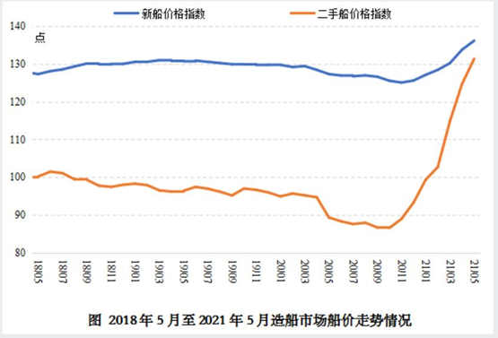 2021年初以來,在航運市場上升需求拉動與用鋼成本上升推動下,全球造船市場新船價格開始上揚。數據顯示,截止2021年5月28日,衡量全球造船市場新船價格總體的克拉克森新船價格指數收于136點,較年初的126點上漲7.9%。分項指數來看,克拉克森散貨船、油船和集裝箱船新船價格指數分別上漲14.8%、8.0%和16.2%。